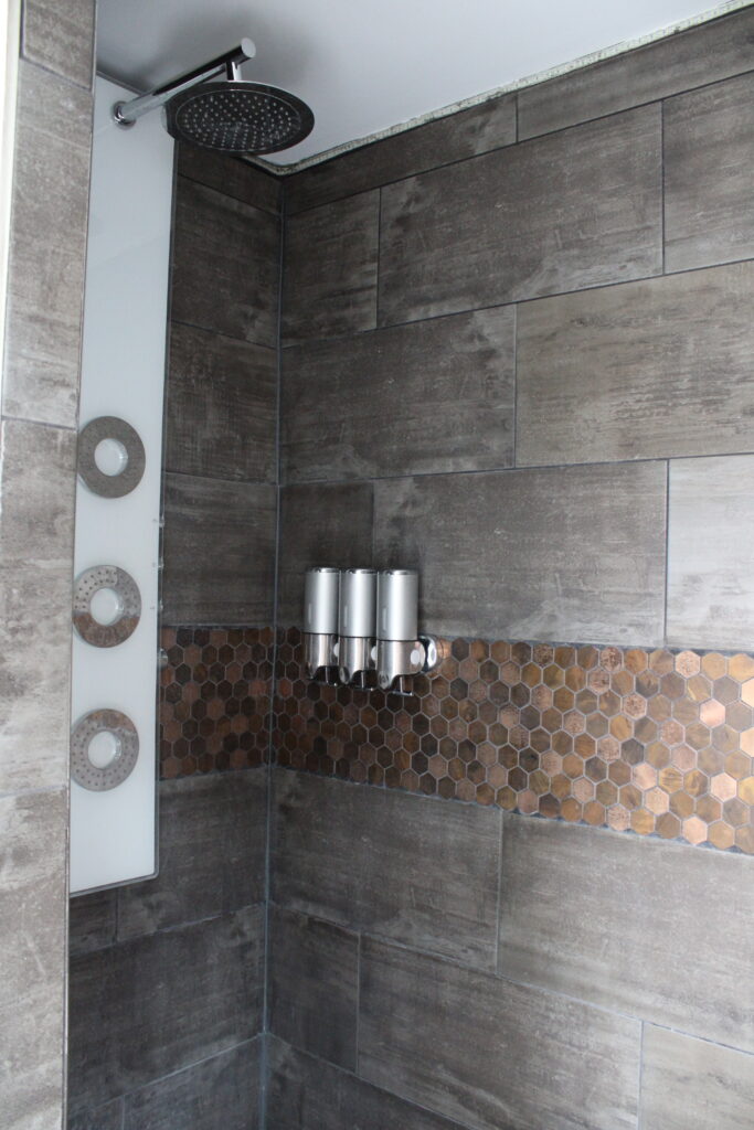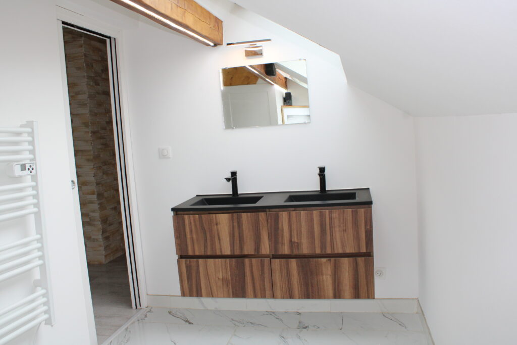 🚿 Salle de bain moderne avec double vasque et douche à jets massants.