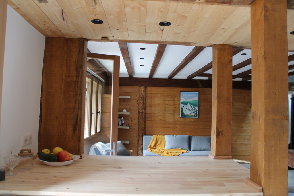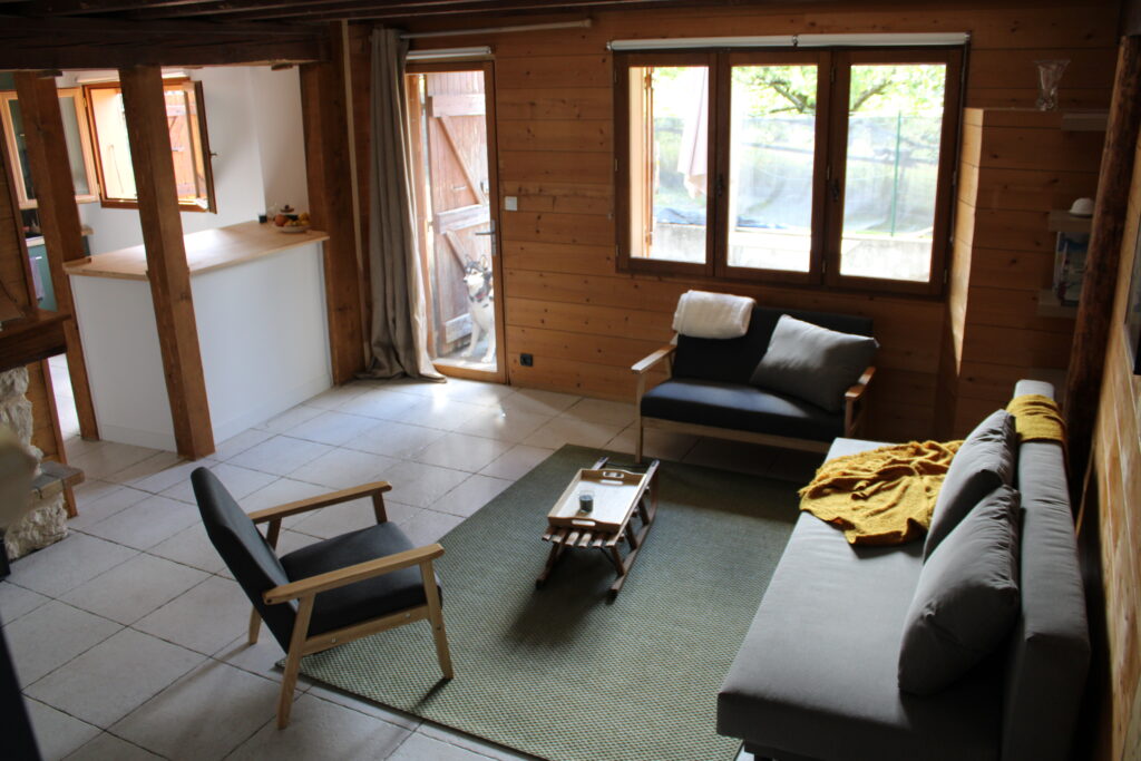 🛋️ Salon confortable et chaleureux avec canapé, convertible et poêle à bois pour des soirées chaleureuses en hiver.